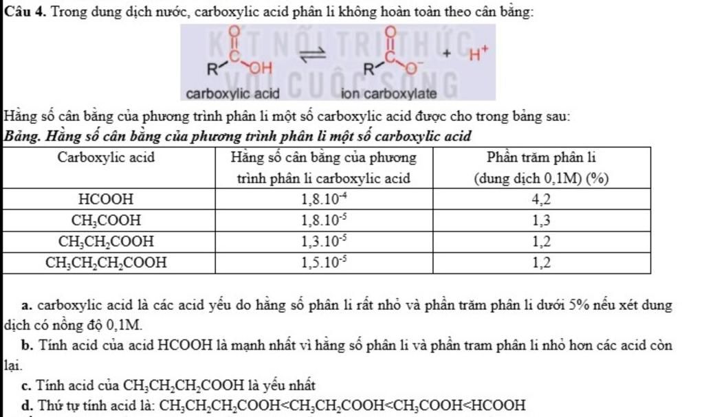 `-` Theo bảng ta thấy hằng số cân bằng của phương trình phân ly `(Ka)` của `CH_3CH_2CH_2COOH`: `1,5.10^-5` > `1,3.10^-5` `(Ka_(CH_3CH_2COOH))` , và phần trăm phân li của `2` `acid` đều là `1,2%`