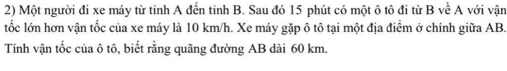 $\Rightarrow \text{Vận tốc ô tô là } x + 10 = \boxed{40 \text{ km/h}}$
