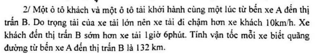 Vì xe khách đến thị trấn `B` sớm hơn xe tải `\text{1,1 h}` nên ta có phương trình