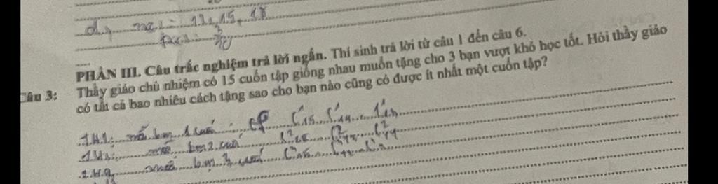 Câu 3: Thầy giáo chủ nhiệm có 15 cuốn tập giống nhau muốn tặng cho 3 bạn vượt khó học tốt. Hỏi thầy giáo