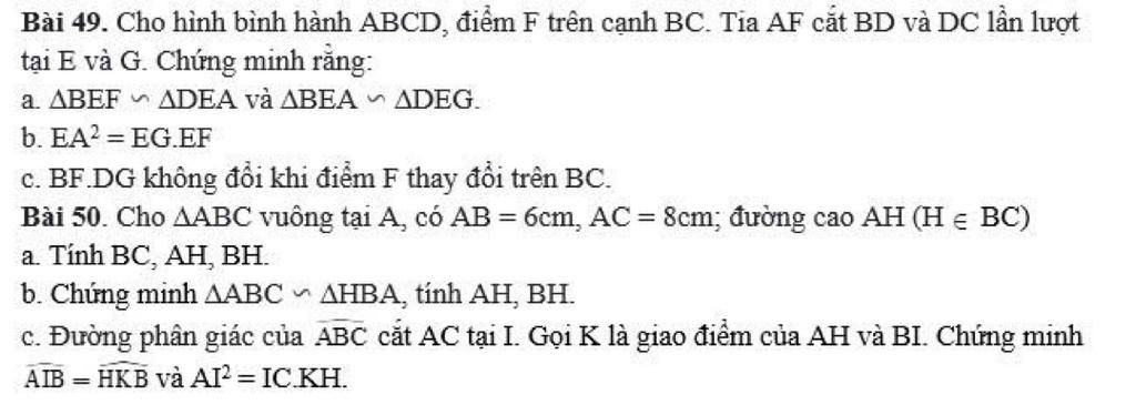 Bài 49. Cho hình bình hành ABCD, điểm F trên cạnh BC. Tia AF cắt BD và DC lần lượt