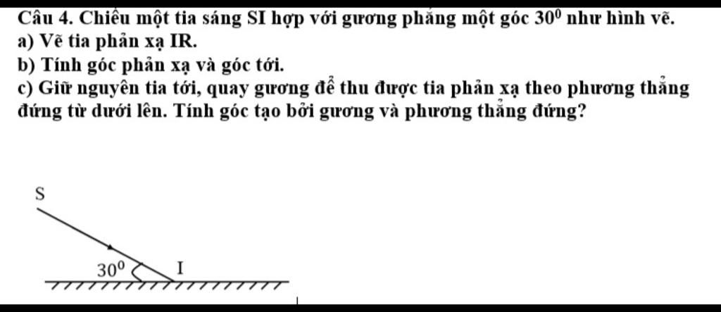 Câu 4. Chiếu một tia sáng SI hợp với gương phẳng một góc 30° như hình vẽ.