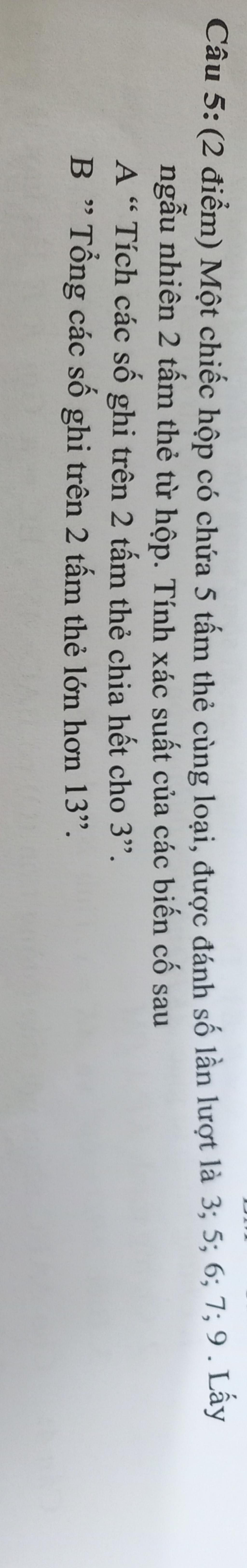 vậy xác xuất cho biến côs A " tích hai tấm thẻ là số chia hết cho 3" là P(A) = 19/20
