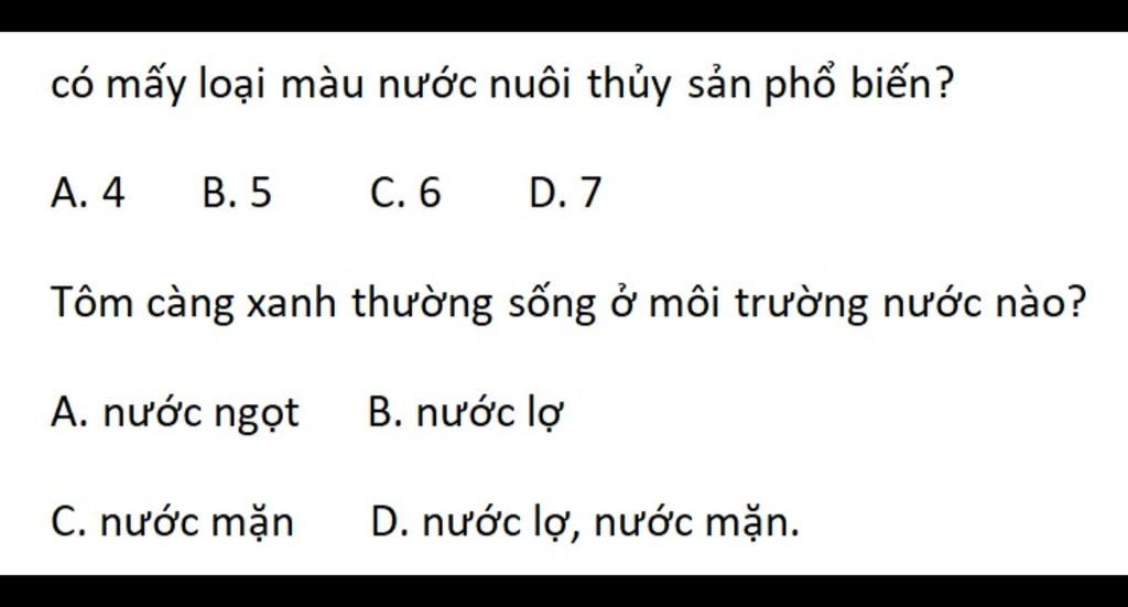$⇒$ Có $4$ loại màu nước nuôi thủy sản phổ biến, đó là:
