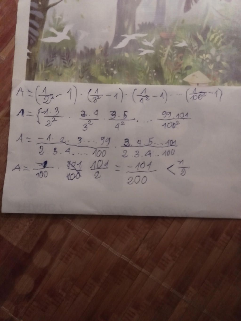 $A=(\dfrac{1}{2^2}-1)(\dfrac{1}{3^2}-1)(\dfrac{1}{4^2}-1)...(\dfrac{1}{100^2}-1)\\ \rightarrow A=\dfrac{1-2^2}{2^2}.\dfrac{1-3^2}{3^2}...\dfrac{1-100^2}{100^2}\\ \rightarrow A=-\dfrac{2^2-1}{2^2}.\dfrac{3^2-1}{3^2}...\dfrac{100^2-1}{100^2}\\ \rightarrow A=-\dfrac{(2-1)(2+1)}{2^2}.\dfrac{(3-1)(3+1)}{3^2}...\dfrac{(100-1)(100+1)}{100^2}\\ \rightarrow A=-\dfrac{1.3}{2.2}.\dfrac{2.4}{3.3}....\dfrac{99.101}{100.100}\\ \rightarrow A=-\dfrac{1.2.3...99}{2.3.4..100}.\dfrac{3.4...101}{2.3.4...100}\\ \rightarrow A=-\dfrac{1}{100}.\dfrac{101}{2}\\ \rightarrow A=-\dfrac{101}{100.2}<-\dfrac{1}{2}$