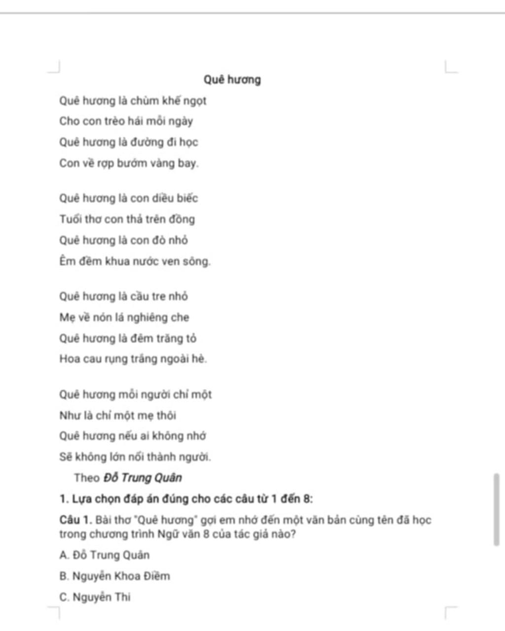 Câu 8: tình cảm của nhà thơ đối với quê hương? A. Tự hào về vẻ đẹp của quê hương B yêu mến vẻ đẹp của quê hương C yêu mến tự hào về vẻ đẹp của quê hương D ca ngợi vẻ đẹp của quê hương