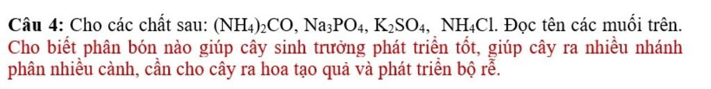 Câu 4: Cho các chất sau: (NH4)2CO, Na3PO4, K2SO4, NHạC1. Đọc tên các muối trên.