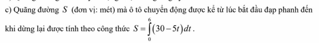 Xe dừng lại khi `v(t) = 0 -> 30 - 5t = 0 -> t = 6 \text{(giây)}`