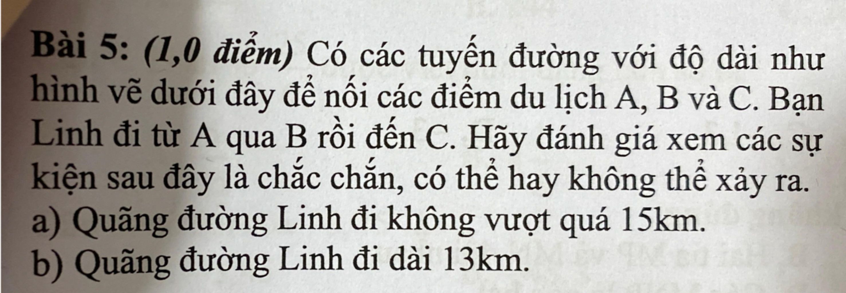 → Nếu có một và chỉ một cách đi từ A đến B rồi đến C mà tổng độ dài đúng bằng 13km, thì sự kiện này là "có thể" xảy ra nếu Linh chọn đúng con đường đó.