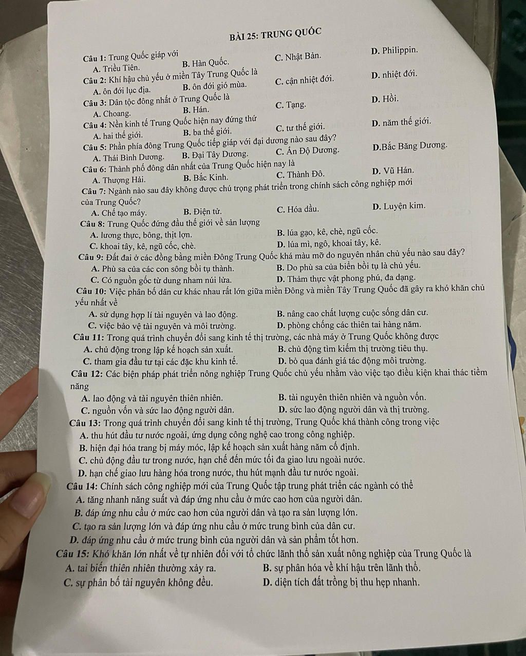 Câu 15: Khó khăn lớn nhất về tự nhiên đối với tổ chức lãnh thổ sản xuất nông nghiệp của Trung Quốc là?
