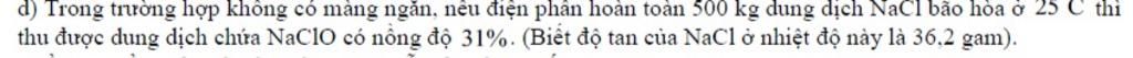 thu được dung dịch chứa NaClO có nồng độ 31%. (Biết độ tan của NaCl ở nhiệt độ này là 36,2 gam).