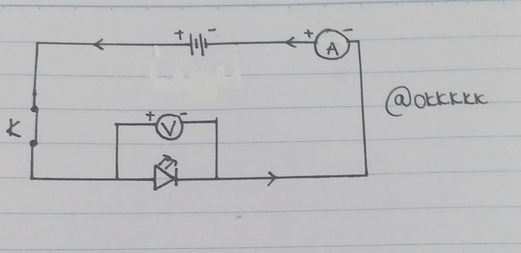 Cho các dụng cụ gồm: Hai nguồn điện mắc nối tiếp, một công tắc, một đèn LED, một ampe kế; một vôn kế và các dây dẫn điện. Hãy vẽ sơ đồ mạch điện để ampe kế có thể đo được cường độ dòng điện chạy qua đèn và vôn kế đo được hiệu điện thế giữa hai đầu của đèn LED. Về chiều dòng điện trong mạch khi khoá K đóng, các chốt của ampe kế và vôn kế?