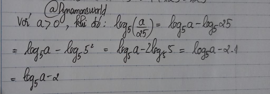 Với mọi số thực `a` dương,`log_(5)` ` (a)/(25)` bằng ?