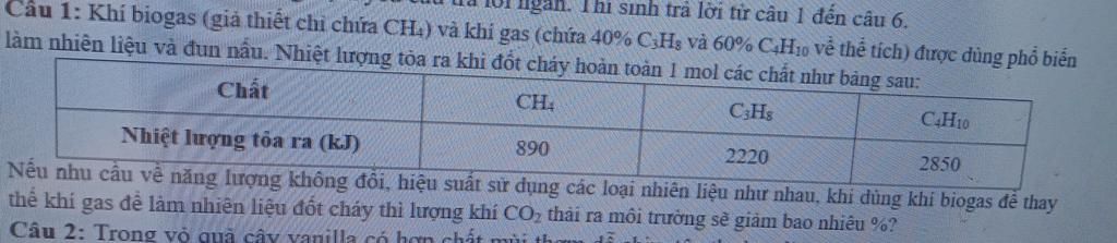 Câu 1: Khí biogas (giả thiết chỉ chứa CH4) và khi gas (chứa 40% CặHg và 60% CặHo về thể tích) được dùng phổ biến
