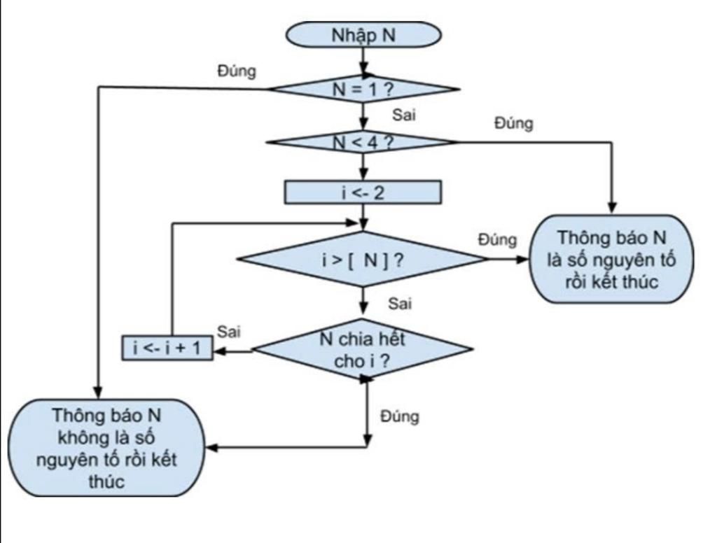Câu 3: Vẽ sơ đồ khối của thuật toán giải bài toán xác định 1 số có phải là số nguyên tố hay không bằng cách chỉ sử dụng những cấu trúc điều khiển cơ bản.