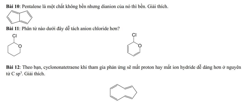 Bài 12: Theo bạn, cyclononatetraene khi tham gia phản ứng sẽ mất proton hay mất ion hydride dễ dàng hơn ở nguyên