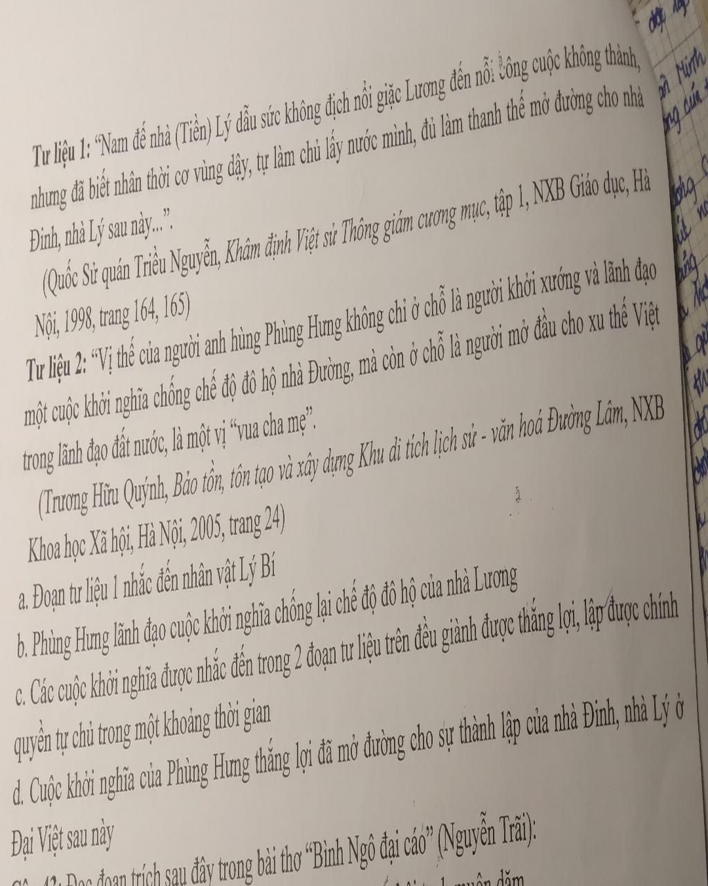 `->` Đoạn tư liệu 1 nhắc đến Lý Bí (Lý Bôn), người lãnh đạo khởi nghĩa chống nhà Lương, lập nước Vạn Xuân (544 - 602).