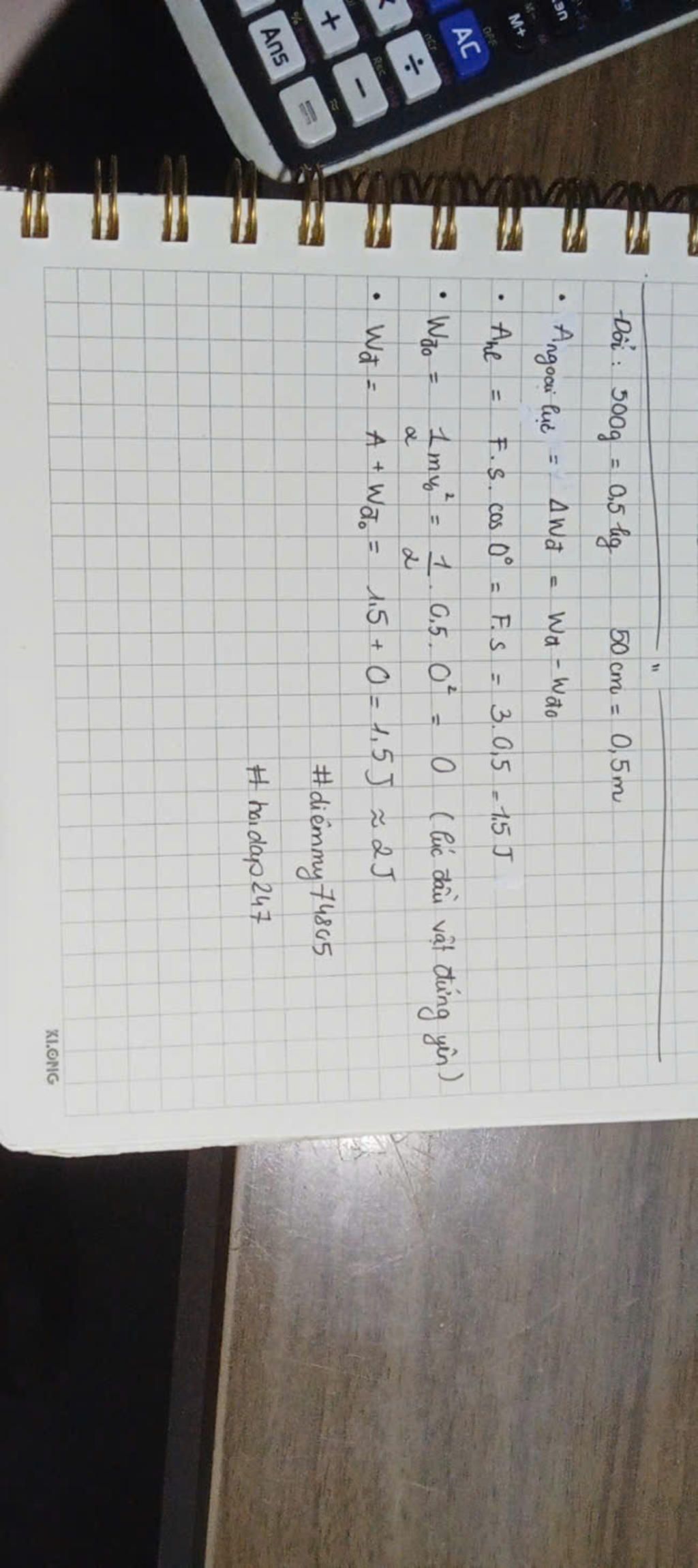 Dữ kiện: $\\$$-$ Khối lượng của vật:$\\$$m = 500g = 0.5kg$$\\$$-$ Lực tác dụng: $\\$$F = 3N$$\\$$-$ Quãng đường: $\\$$s = 50cm = 0.5m$$\\$$\text {Giải: }$$\\$$+$ Công của lực là:$\\$$A = F.s = 3 . 0.5 = 1,5 J$ $\\$$+$ Theo định lí động năng: $\\$$A = \Delta W = W_2 - W_1$$\\$Mà $W_1 = 0$ (vì vật đứng yên ban đầu)$\\$$\Rightarrow W = A = 1,5 J$ $\\$$\Rightarrow W = 1,5 J$$\\$Vậy động năng của vật là $2 J$