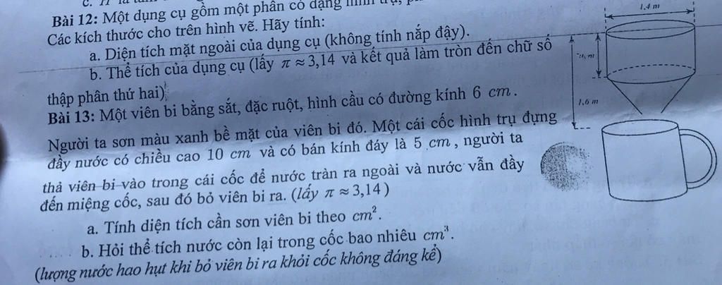 b. Thể tích của dụng cụ (lấy 7 ~ 3,14 và kết quả làm tròn đến chữ số
