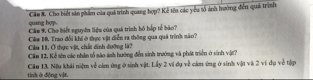 Câu `9:` Glucôzơ (hoặc các chất hữu cơ khác) và Oxy (trong hô hấp hiếu khí).