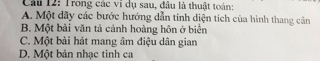 Câu `12:` Trong các ví dụ sau, đâu là thuật toán?