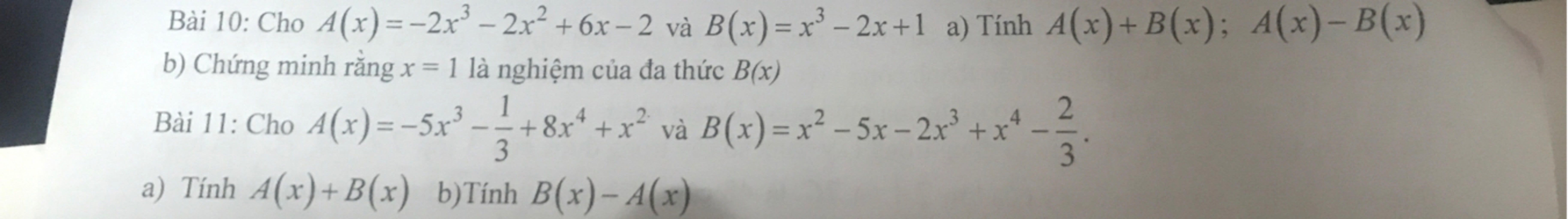 Bài 10: Cho 4(x)=−2x3 – 2x2 + 6x − 2 và B(x)=x* −2x+1 a) Tính A(x)+B(x); A(x)-B(x)
