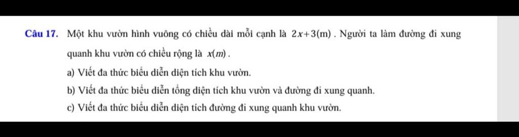 `b)` Đa thức biểu diễn độ dài `1` cạnh khu vườn và đường đi là: