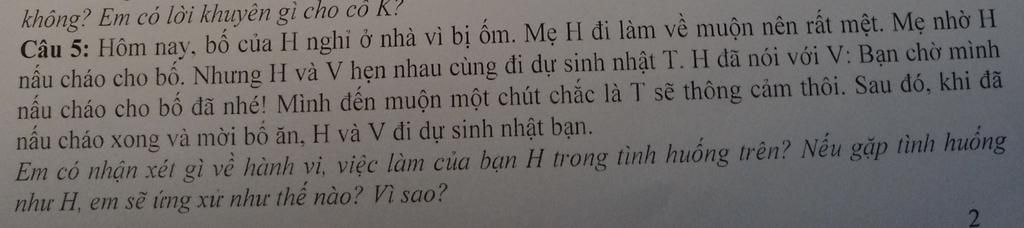 `-` H đã thể hiện sự hiếu thảo và trách nhiệm khi ưu tiên chăm sóc bố trước khi tham gia buổi sinh nhật. H không vì kế hoạch cá nhân mà bỏ qua lời nhờ vả của mẹ.