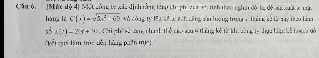 số x(t)=20t+40 . Chi phí sẽ tăng nhanh thế nào sau 4 tháng kể từ khi công ty thực hiện ...