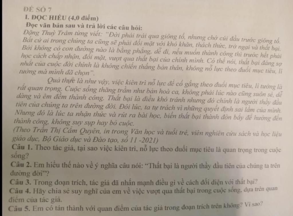 Em hoàn toàn tán thành với quan điểm của tác giả. Trong cuộc sống, không ai tránh khỏi thất bại. Thất bại không phải là dấu chấm hết mà là cơ hội để con người nhìn lại bản thân, học hỏi và trưởng thành. Chính sự kiên trì và ý chí vượt qua khó khăn mới là yếu tố giúp con người đạt được mục tiêu và thành công.