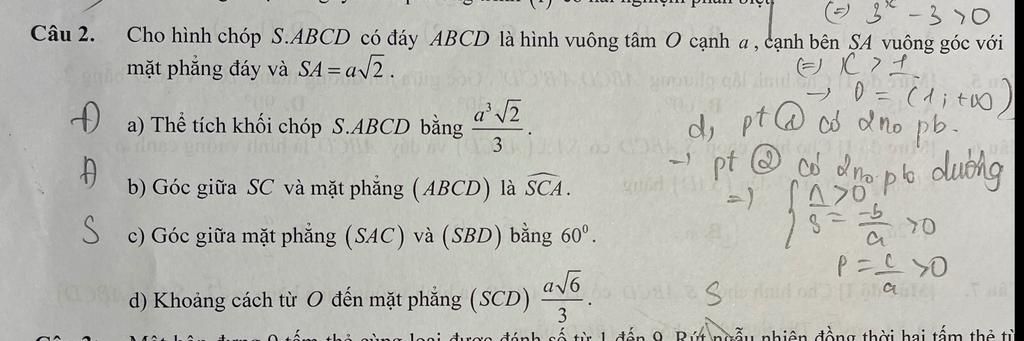`d(O;(SCD))=1/2d(A;(SCD))=AH.1/2=1/2 . sqrt(1/(1/(SA)^2+1/(AD)^2))=(asqrt6)/6`