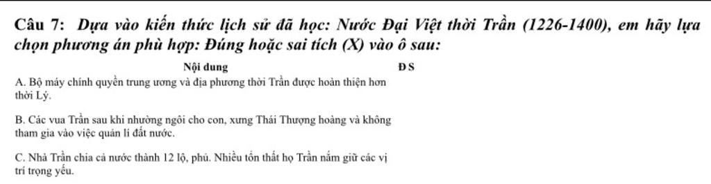 ⇒ Giải thích: Cả nước được chia thành 12 lộ, phủ. Nhiều tôn thất họ Trần nắm giữ các vị trí trọng yếu trong triều, ở các địa phương và được phép lập thái ấp.