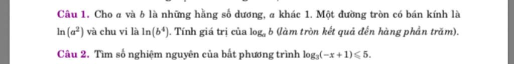 Như vậy, từ đề bài ta có: `ln(b^4)=2ln(a^2).\pi`.