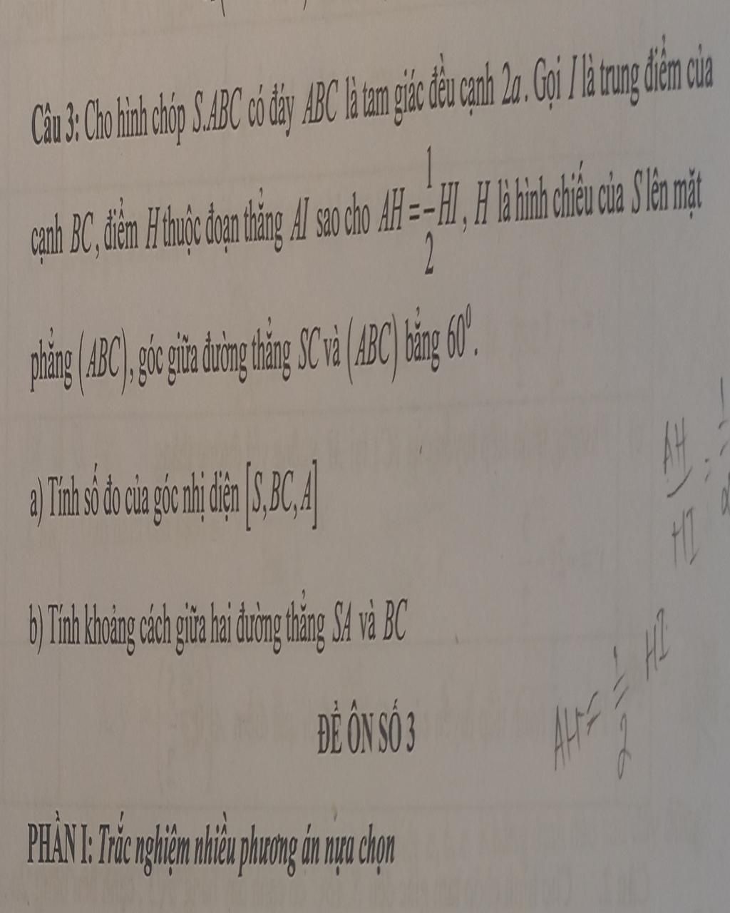 Câu 3: Cho hình chóp S.ABC có đáy ABC làtam giác đều cạnh a. Gọi I là trung điểm của