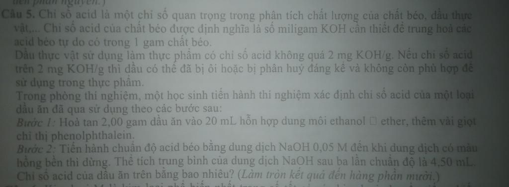 `=>` Chỉ số acid béo là: `(2,25.10^{-4}.56.10^3)/2 = 6,3 (mg//g)`
