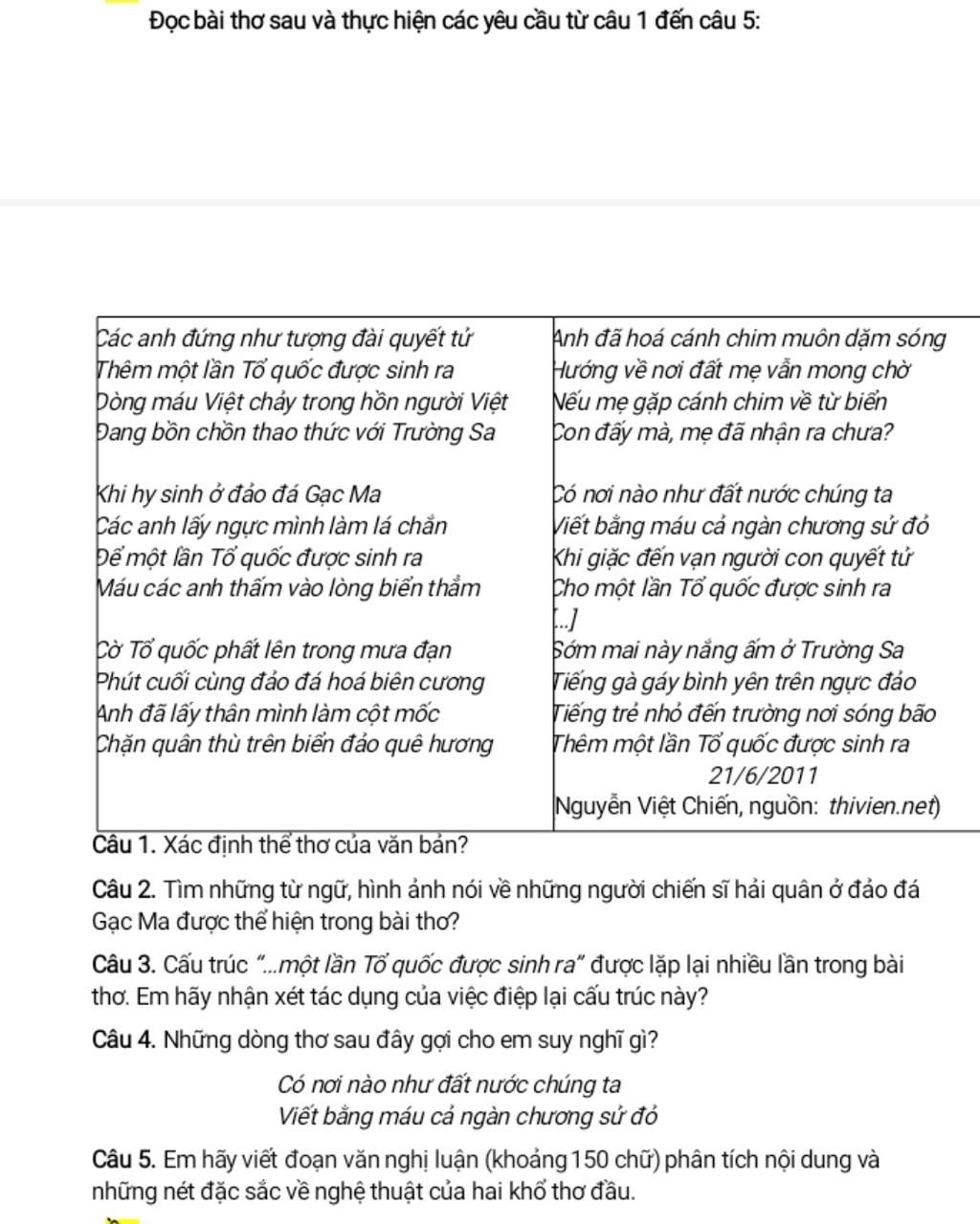 Đọc bài thơ sau và thực hiện các yêu cầu từ câu 1 đến câu 5: