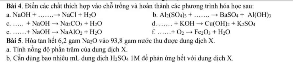 Bài 4. Điền các chất thích hợp vào chỗ trống và hoàn thành các phương trình hóa học sau: