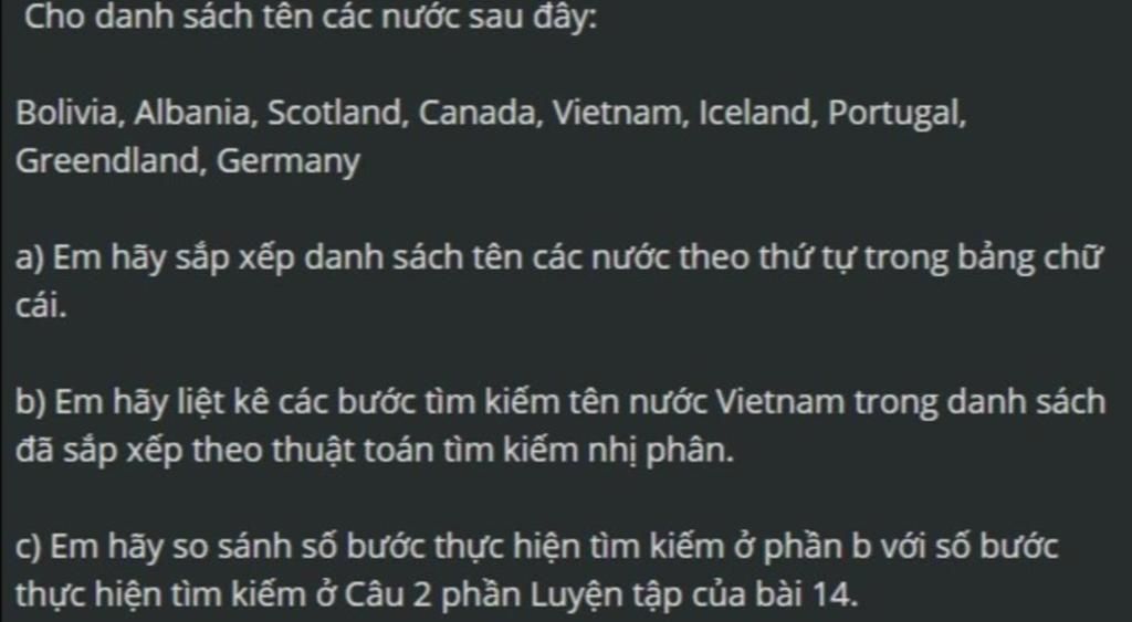 b) Em hãy liệt kê các bước tìm kiếm tên nước Vietnam trong danh sách