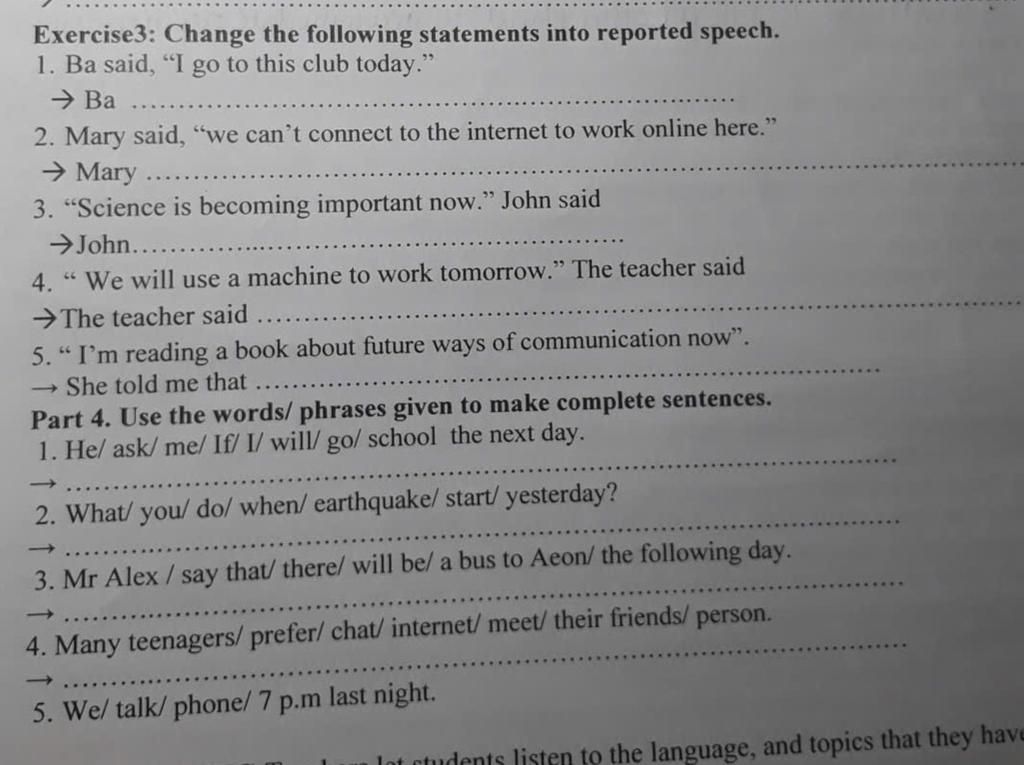 ----> CT Reported Speech: S + said (that) + S + V lùi thì; trạng từ today chuyển thành that day.