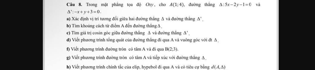 `\Delta: 5x-2y-1=0` và `\Delta': -x+y+3=0` , `A(1;4)`