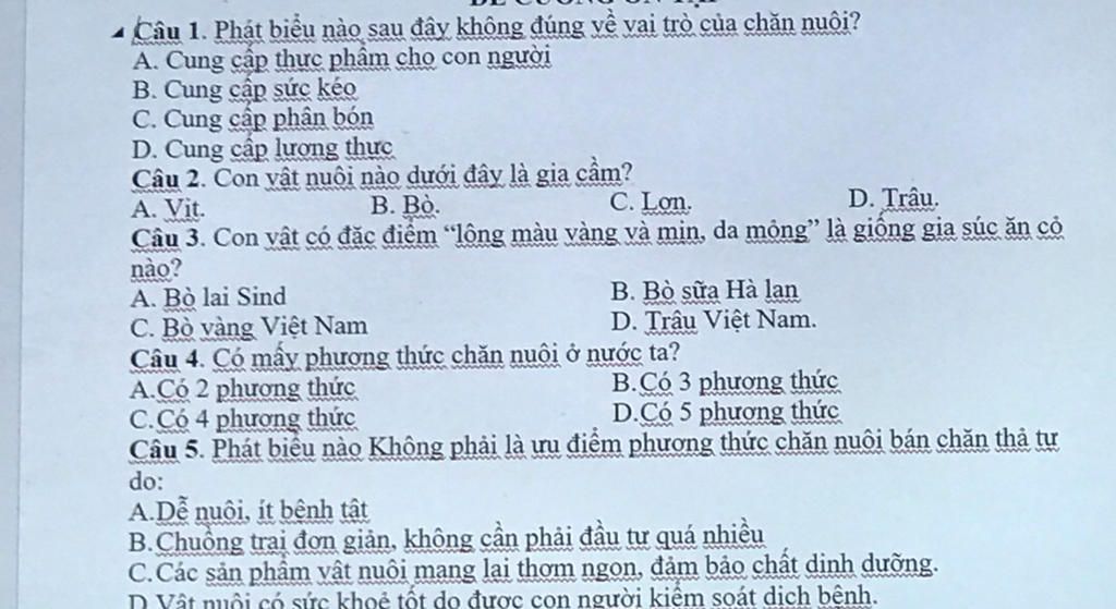 Câu 1: Phát biểu nào sau đây không đúng về vai trò của chăn nuôi?