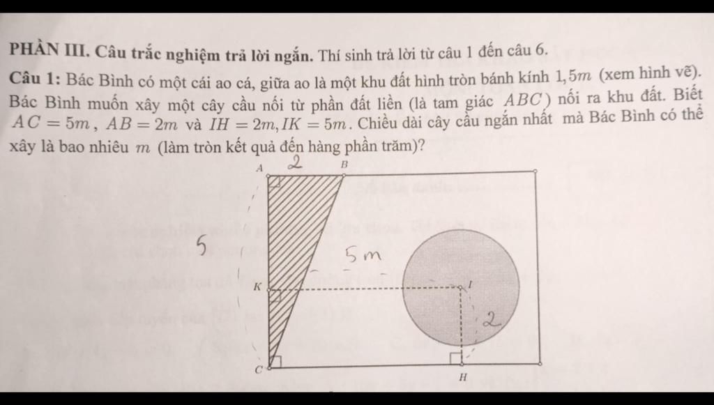 Bác Bình muốn xây một cây cầu nối từ phần đất liền (là tam giác ABC) nối ra khu đất. Biết