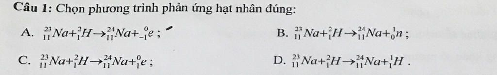 Phương trình \({}_{11}^{23}Na + {}_1^2H \to {}_{11}^{24}Na + {}_1^1H\) thỏa mãn cả 2 định luật bảo toàn số khối và điện tích.