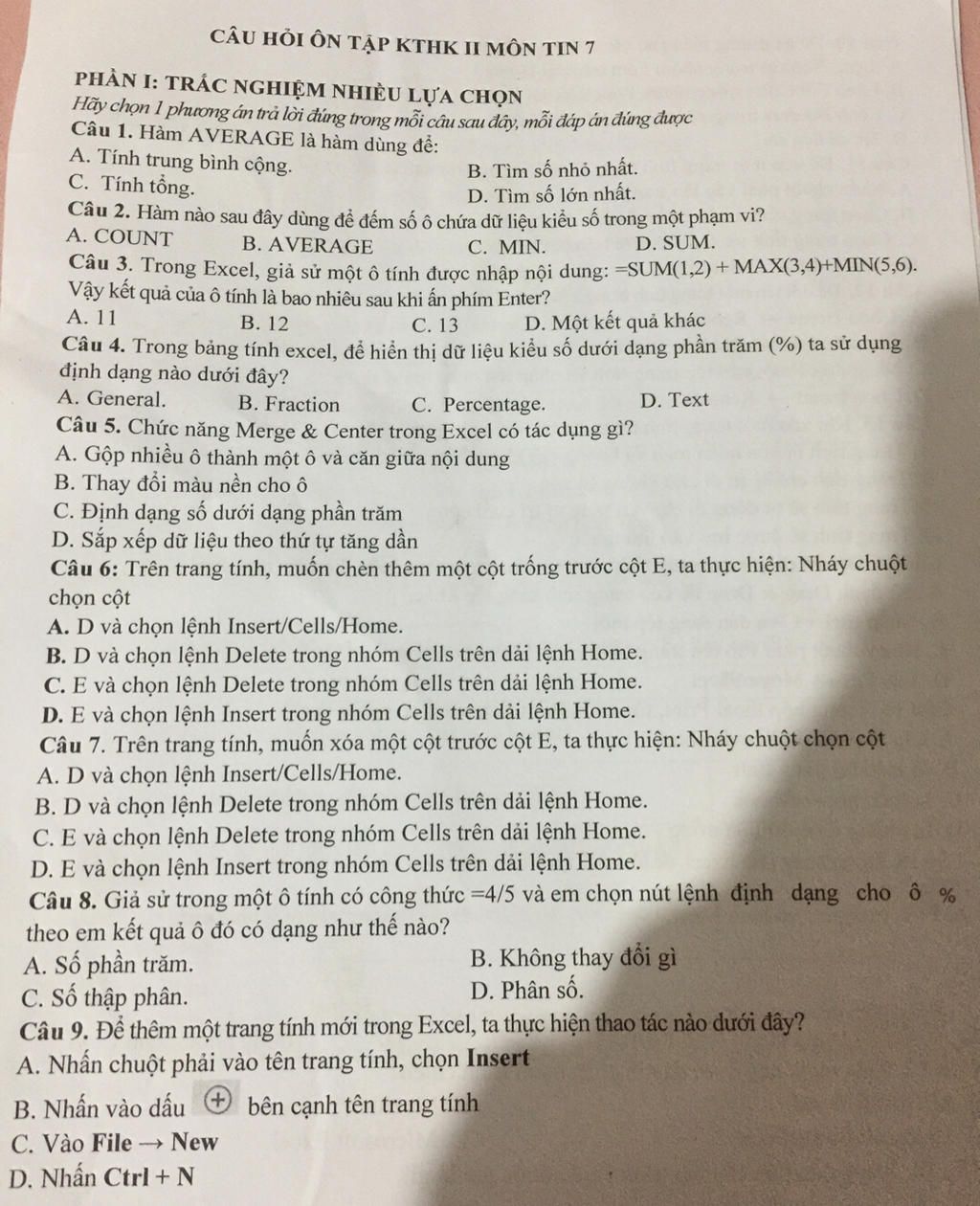 CÂU HỎI ÔN TẬP KTHK II MÔN TIN 7
