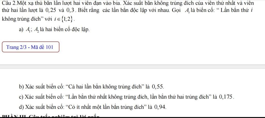 Câu 2.Một xạ thủ bắn lần lượt hai viên đạn vào bia. Xác suất bắn không trúng đích của viên thứ nhất và viên