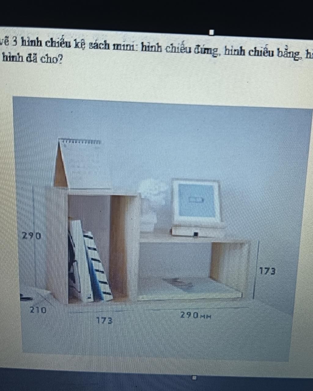 Vẽ 3 hình chiếu đứng, cạnh, bằng của kệ sách mini trên... Giúp em với ạ, em đang cần gấp