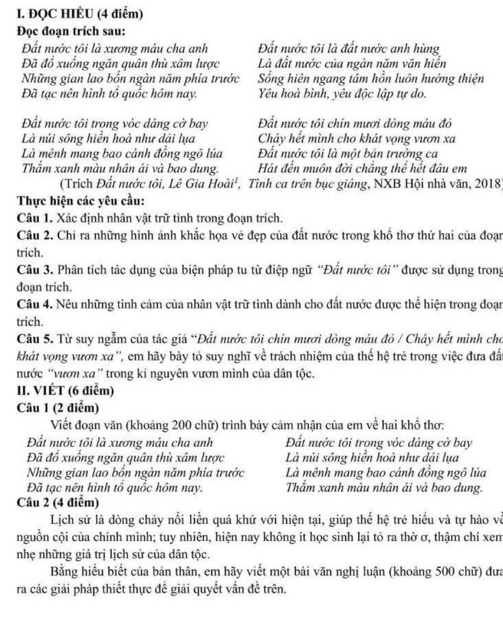 5. Đọc đoạn thơ em càng cảm nhận sâu sắc vẻ đẹp thiêng liêng của đất nước được tạo nên từ thiên nhiên tươi đẹp và xương máu cha ông. Thế hệ trẻ hôm nay biết ơn, trân trọng quá khứ, ra sức học tập, rèn luyện đạo đức và bản lĩnh để tiếp nối sự nghiệp xây dựng đất nước giàu mạnh, văn minh. Giữ gìn từng tấc đất, từng giá trị văn hóa truyền thống, đồng thời đổi mới, sáng tạo để đất nước phát triển bền vững trong thời đại mới. Đó chính là cách thiết thực nhất để đáp đền công lao tổ tiên và viết tiếp trang sử vẻ vang cho dân tộc.