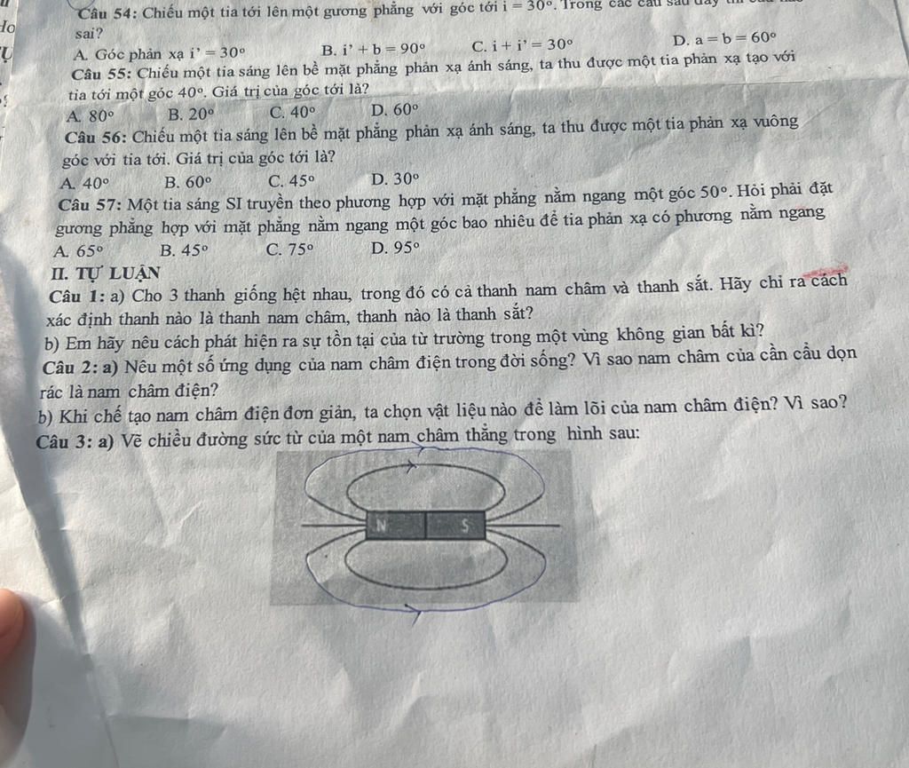 Câu 55: Chiếu một tia sáng lên bề mặt phẳng phản xạ ánh sáng, ta thu được một tia phản xạ tạo với