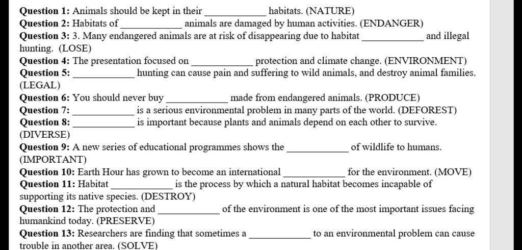 `-` Habitats of endangered animals : Môi trường sống của các loài động vật bị đe dọa.