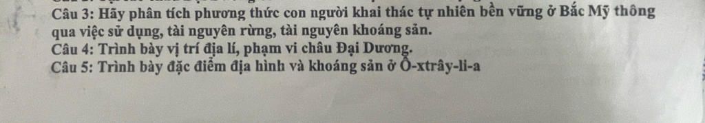 Câu 4:Châu Đại Dương nằm giữa Thái Bình Dương mênh mông. + Tổng diện tích là 8,5 triệu km2. + Bao gồm lục địa Ô-xtrây-li-a, quần đảo Niu-di-len, ba chuỗi đảo san hô và đảo núi lửa Ma-la-nê-di, Mi-crô-nê-di, Pô-li-nê-di và vô số đảo nhỏ trong Thái Bình Dương.